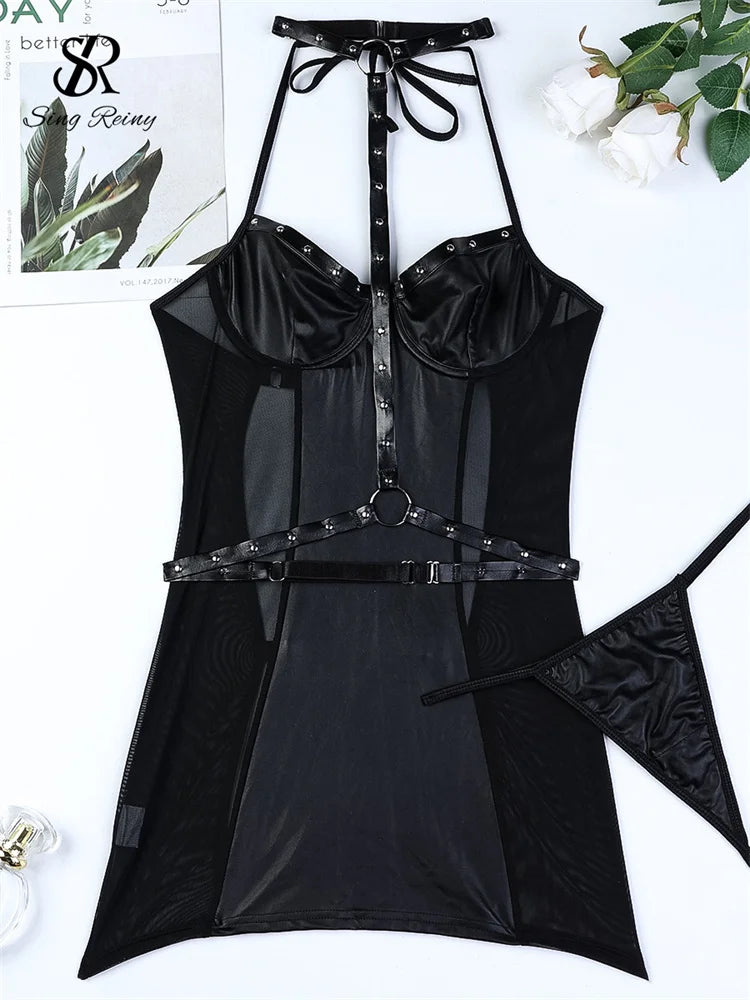SINGREINY Club Mesh Spliced Leather Sexy Dress Fashion Bandage Hollow Out Slim Dress 2024 Women Halter PU Backless Sensual Dress