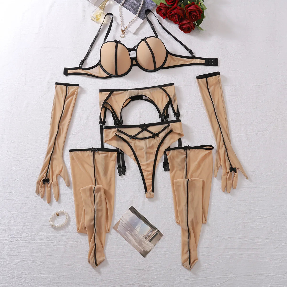Toucheart Sexy Lingerie Suit for Women Mesh Hollow Out Sexy Underwear 5-piece Set Women's Sexy Lingerie Gloves Stockings Set New