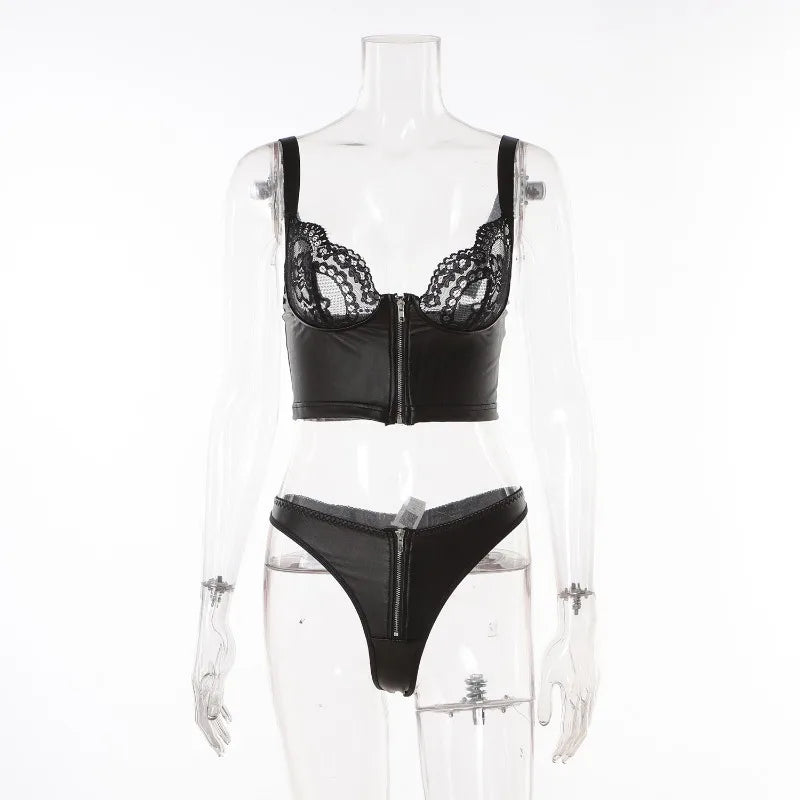 Toucheart Sexy PU Women's Underwear Solid Color With Zipper PU Patchwork Mesh Lace See Through Bra Set Sexy PU Underwear New